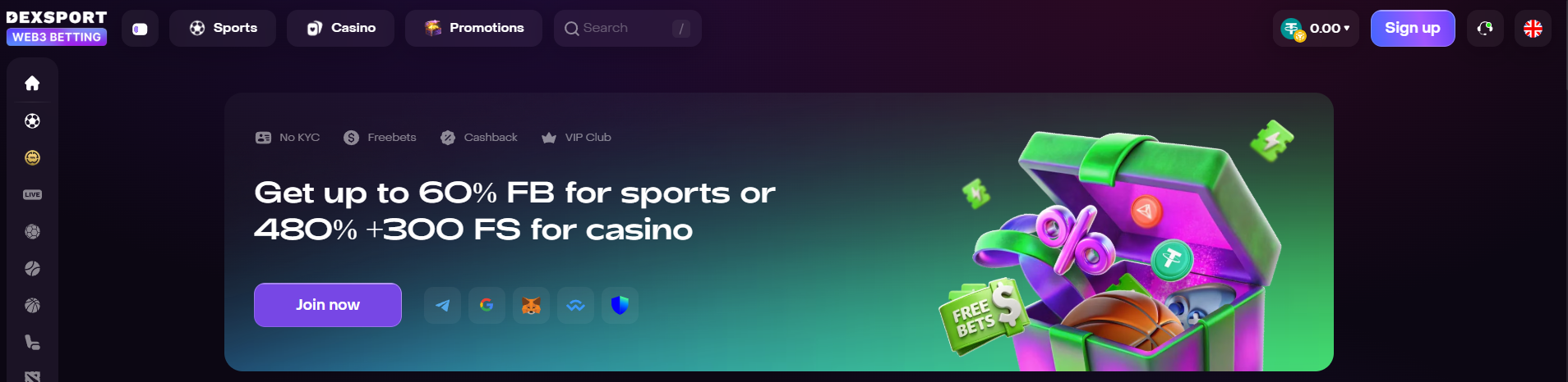 Dexsport removes that layer. Users can register via email, Telegram or cryptocurrency wallet and start betting immediately, without providing identity documents.